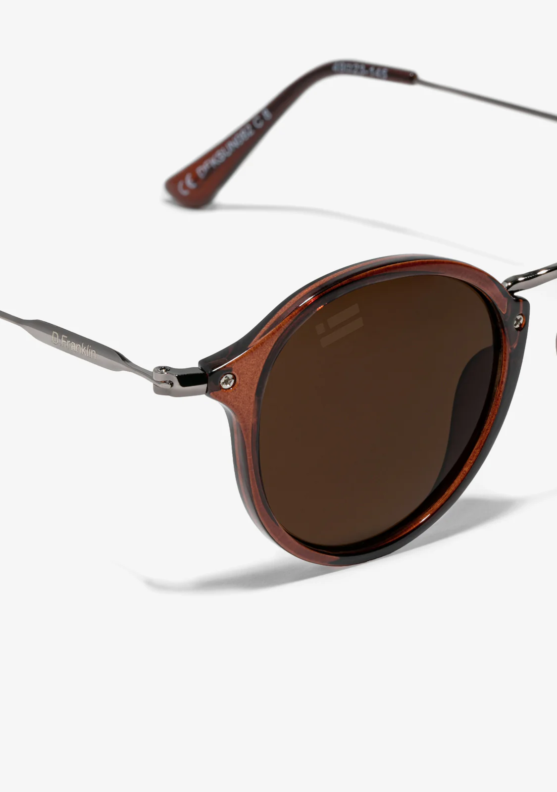 Rounded brown tinted lenses and brown tinted frames reinforce the seventies aesthetic of this model. It features our signature D.Franklin details: the logo engraved on both metal temples and our emblem on the right lens. With a lens width of 49mm and a 148mm front width frame, these glasses will flatter most faces. The side temples are 145mm long.